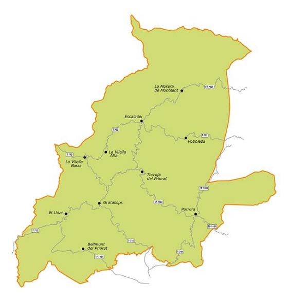 Forman parte 11 de los 23 municipios de la comarca del Priorat. Se trata de los municipios de La Morera de Montsant y su agregado Escaladei, La Vilella Alta, La Vilella Baixa, Gratallops, Bellmunt del Priorat, Porrera, Poboleda, Torroja del Priorat, El Lloar, la parte norte del municipio de Falset y la parte este del termino municipal de El Molar. La introducción del viñedo, así como su expansión, se debe en gran medida a la fundación, durante el siglo XII, de la Cartoixa d’Escaladei. Siete pueblos de los alrededores estaban sometidos al dominio feudal del prior de la abadia y de aquí le viene a esta zona el nombre de Priorat.